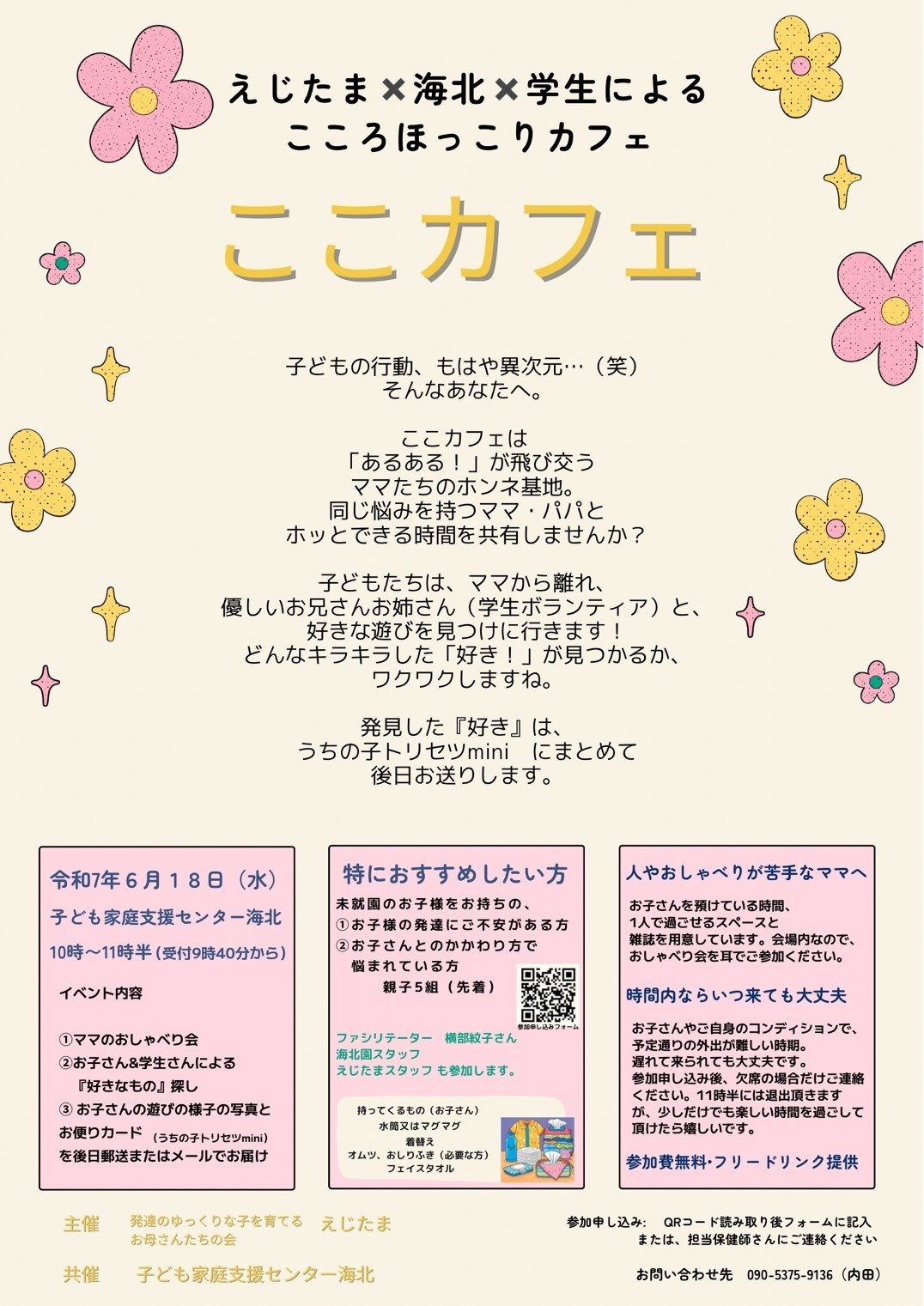 未就園のお子さまの発達にご不安のある方、お子さまとの関わり方で悩まれている方、同じ悩みを持つママやパパと、ホッと出来る時間を共有しませんか?お子さまにはスタッフと学生ボランティアが対応します(^^)